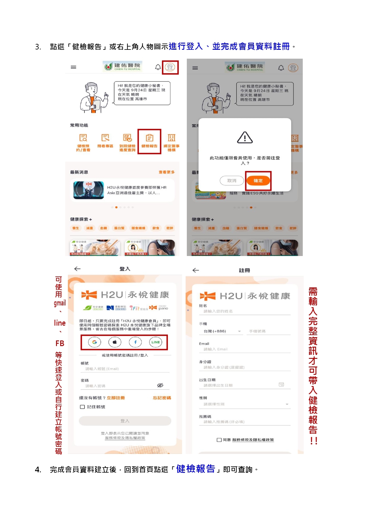 點選「健檢報告」或右上角人物圖示進行登入、並完成會員資料註冊。