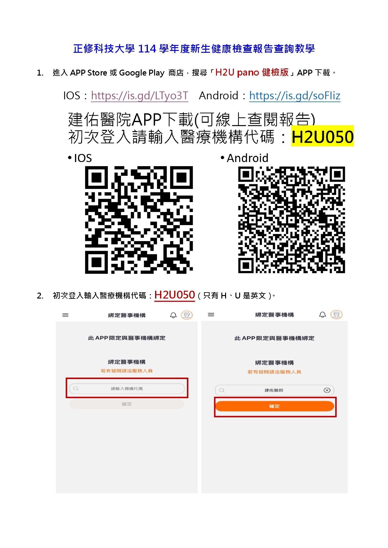 提醒:僅限於配合本校簽約醫院(建佑醫院)完成健康檢查之學生可供查詢。請依下列步驟下載及登入註冊: