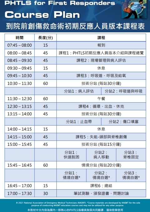 四、報名費用:2,500元整(含證照費,不含教材費用),通過測 驗將頒發美國國家緊急救護技術員學會(NAEMT)授權之證書。