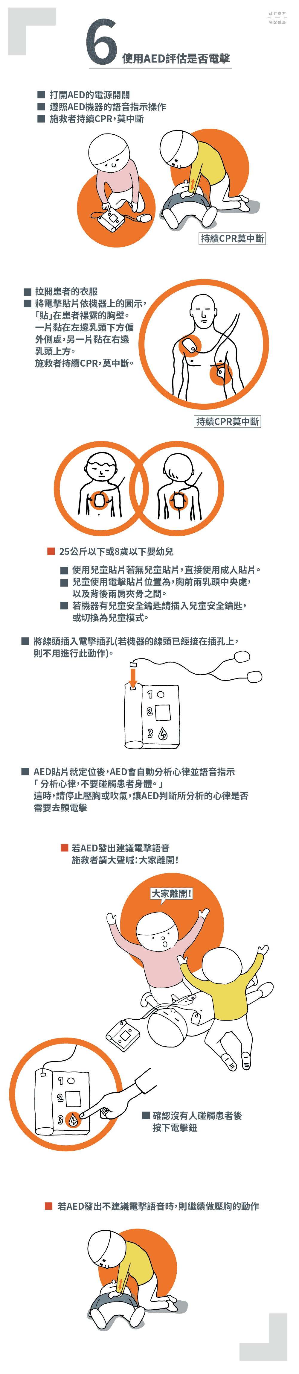 聰明的你肯定沒忘記口訣的最後一個字:「電」,這個階段的目的是利用 AED 使患者恢復心跳、提升存活率,若急救現場能順利取得 AED,你應交替使用 AED 與壓胸按摩,否則應持續壓胸不中斷。