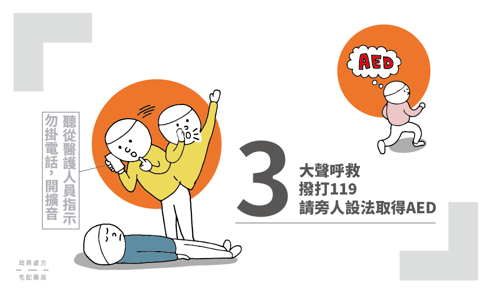 叫:大聲呼救、撥打119、設法取得 AED